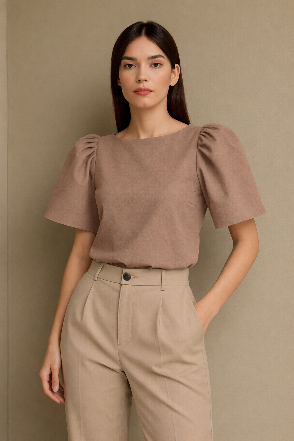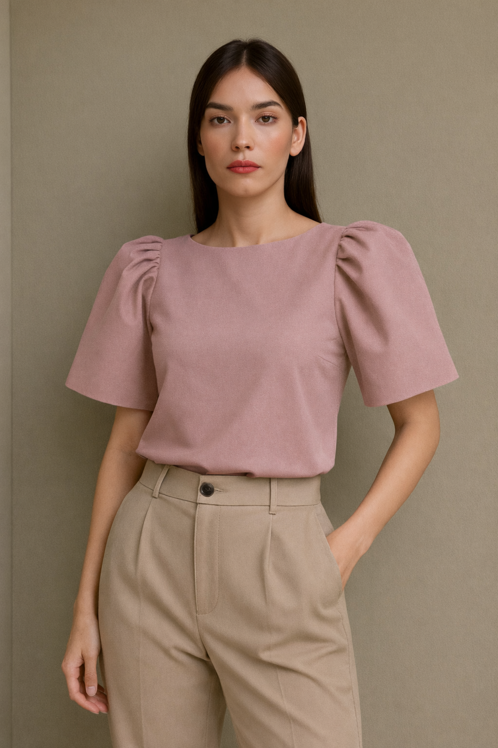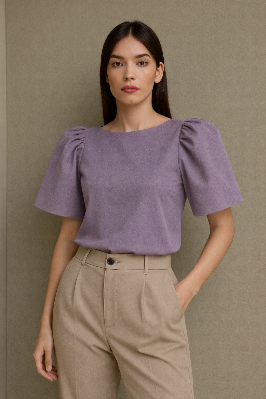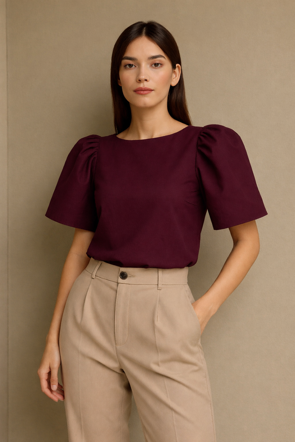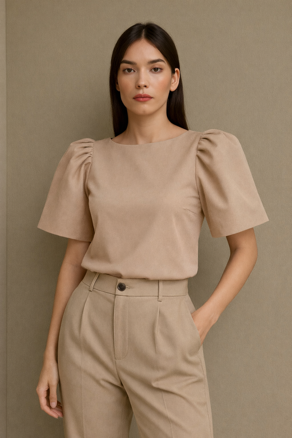 This look features a modern structured top with Filipiniana-inspired butterfly sleeves that give the shoulders a strong, elegant silhouette. The neckline is modest and clean, with a boxy, slightly cropped fit that hits just above the hips.